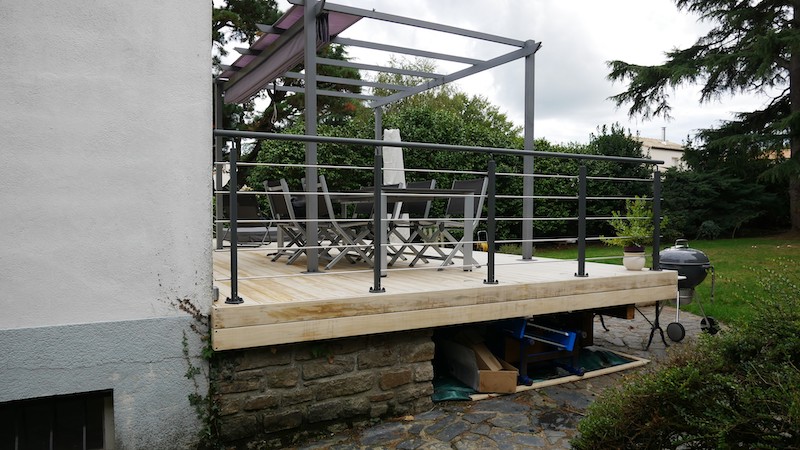 La sécurité n’a pas été oubliée, des garde-corps en aluminium ceinturent la terrasse et l’escalier.