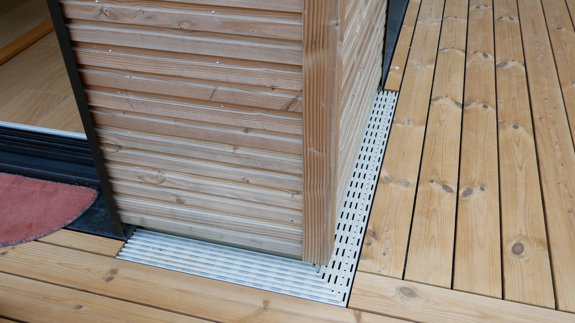 Cette terrasse, à La Chapelle sur Erdre près de Nantes, a été réalisée sur un sol stabilisé et entoure une extension de la maison avec un bardage bois. Pour protéger ce bardage en pied, nous avons installé des « grilles de ventilation et anti-éclaboussures ». Cette innovation GRAD est très efficace et indispensable pour prévenir toute détérioration du bardage.