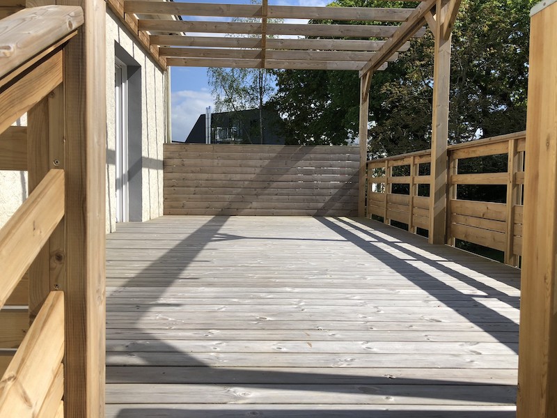 terrasse sur poteaux en extension de balcon avec pergola et garde-corps à GUERANDE